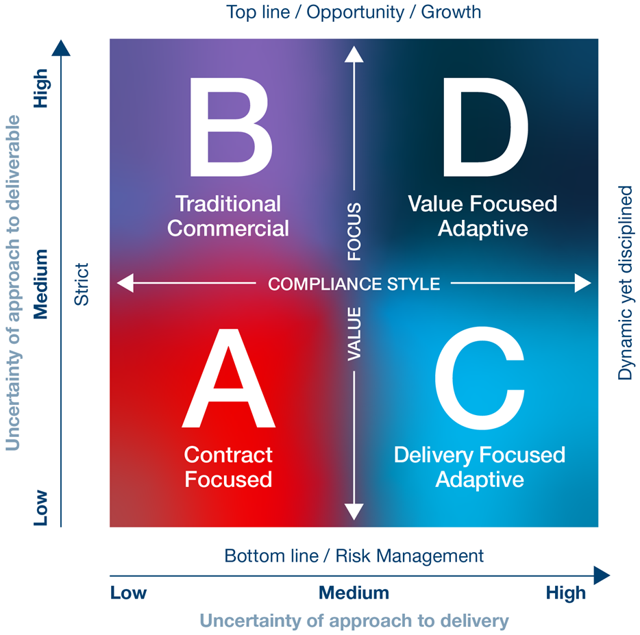 When we published our report in 2019, this issue was identified as one of the key findings. We observed that a leading practice in post-award contract management would shift thinking from ‘risk management’ and instead embrace ‘uncertainty analysis and management’. This approach led us to create a new ‘Value-Compliance-Uncertainty Framework’ (see chart below), a method by which organizations position their contracts into a risk and uncertainty model which guides the form of agreement and the depth of contract management skills that will be required. The adoption of this model by several leading corporations has equipped them to better identify and manage risk and uncertainty – a critical capability in today’s business environment.